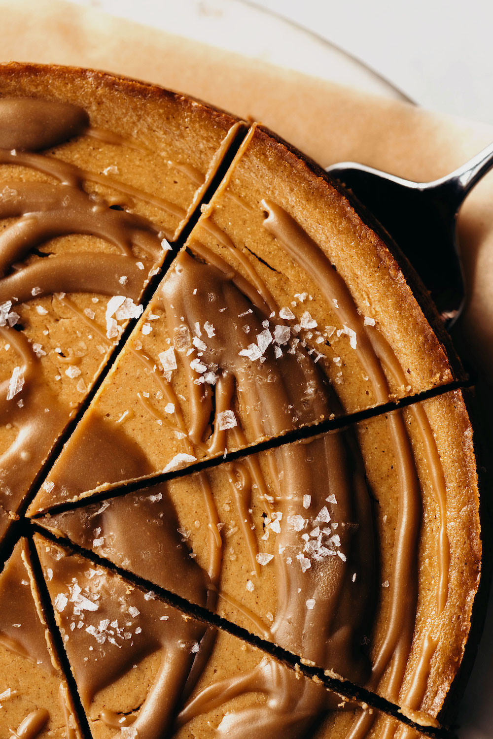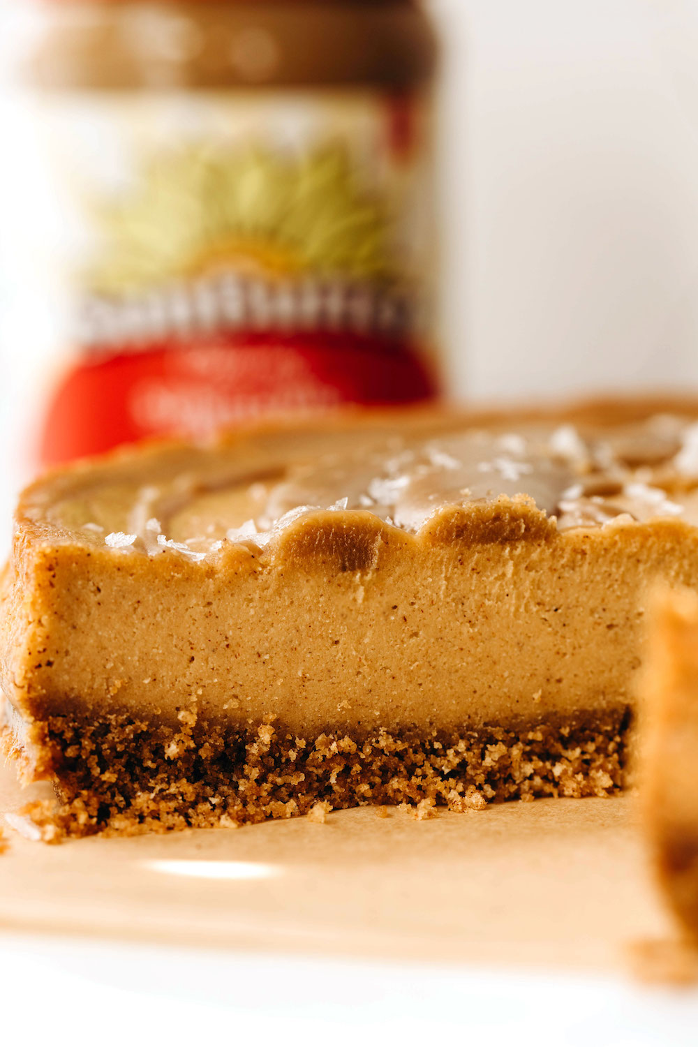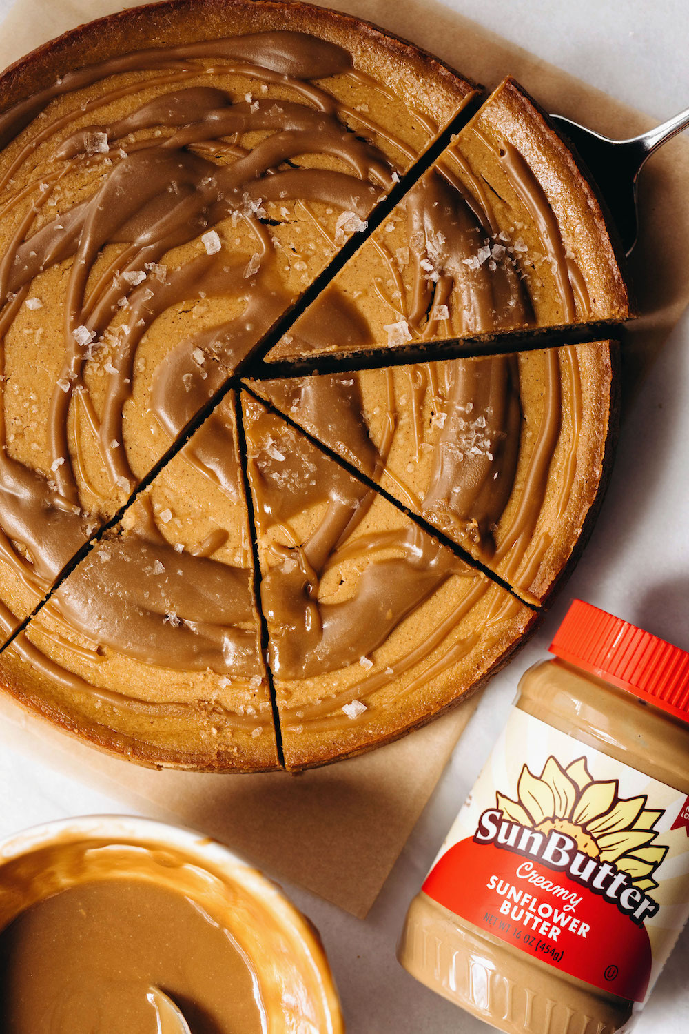 The delicious finishing swirl to our already decadent dessert: SunButter caramel sauce. And even better, this one requires no cooking at all just a simple whisk. Combine Creamy SunButter with equal parts liquid sweetener of choice (I used maple syrup, the flavor is so yummy with pumpkin spice!), a couple tablespoons of coconut oil, vanilla, and salt. Whisk until silky and drizzle-able, heating briefly if it’s too thick or chilling briefly if it’s too thin. You can use this sauce for so many things, but swirling on top of your cooled and ready-to-be-cut pumpkin cheesecake should definitely be one of them.
