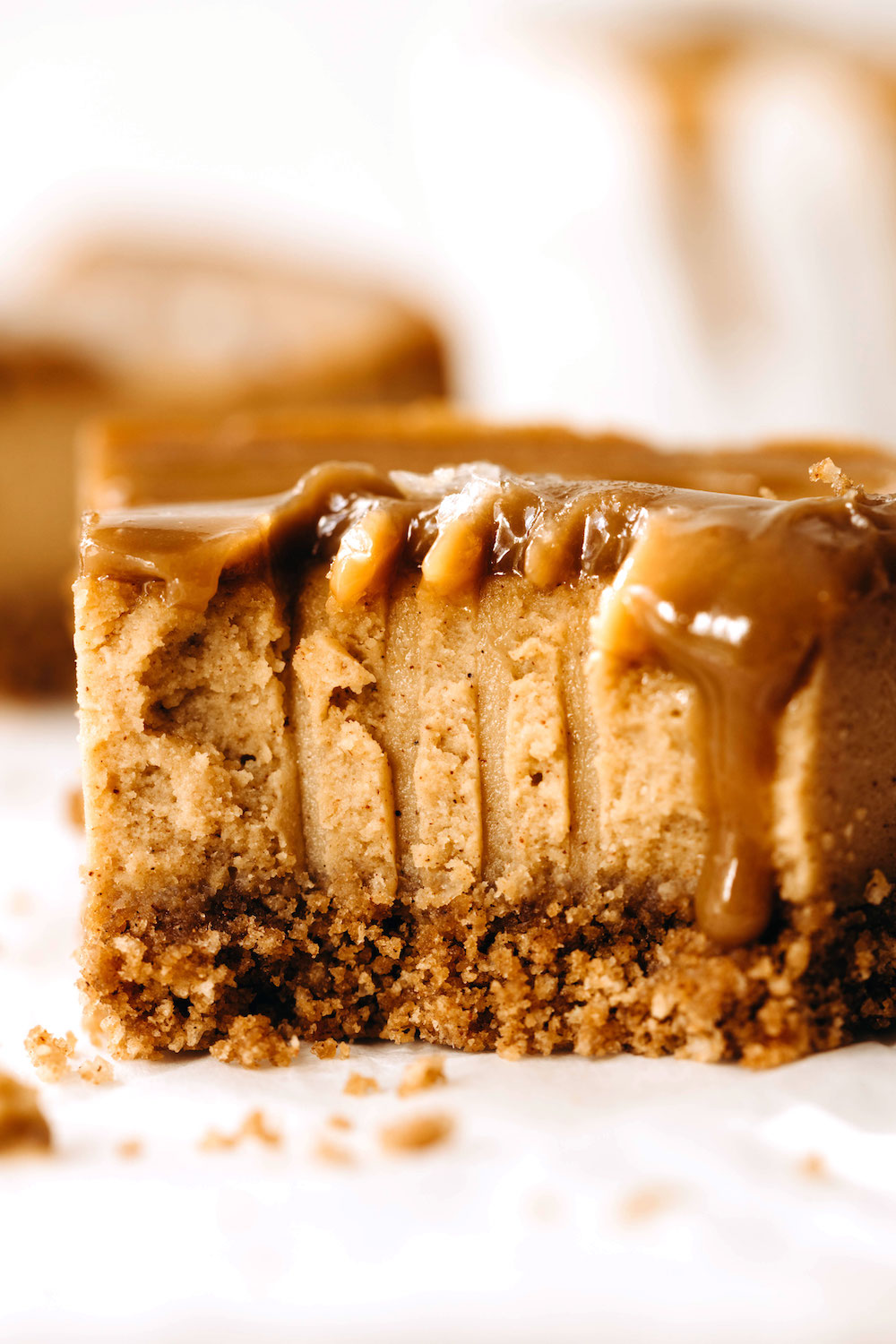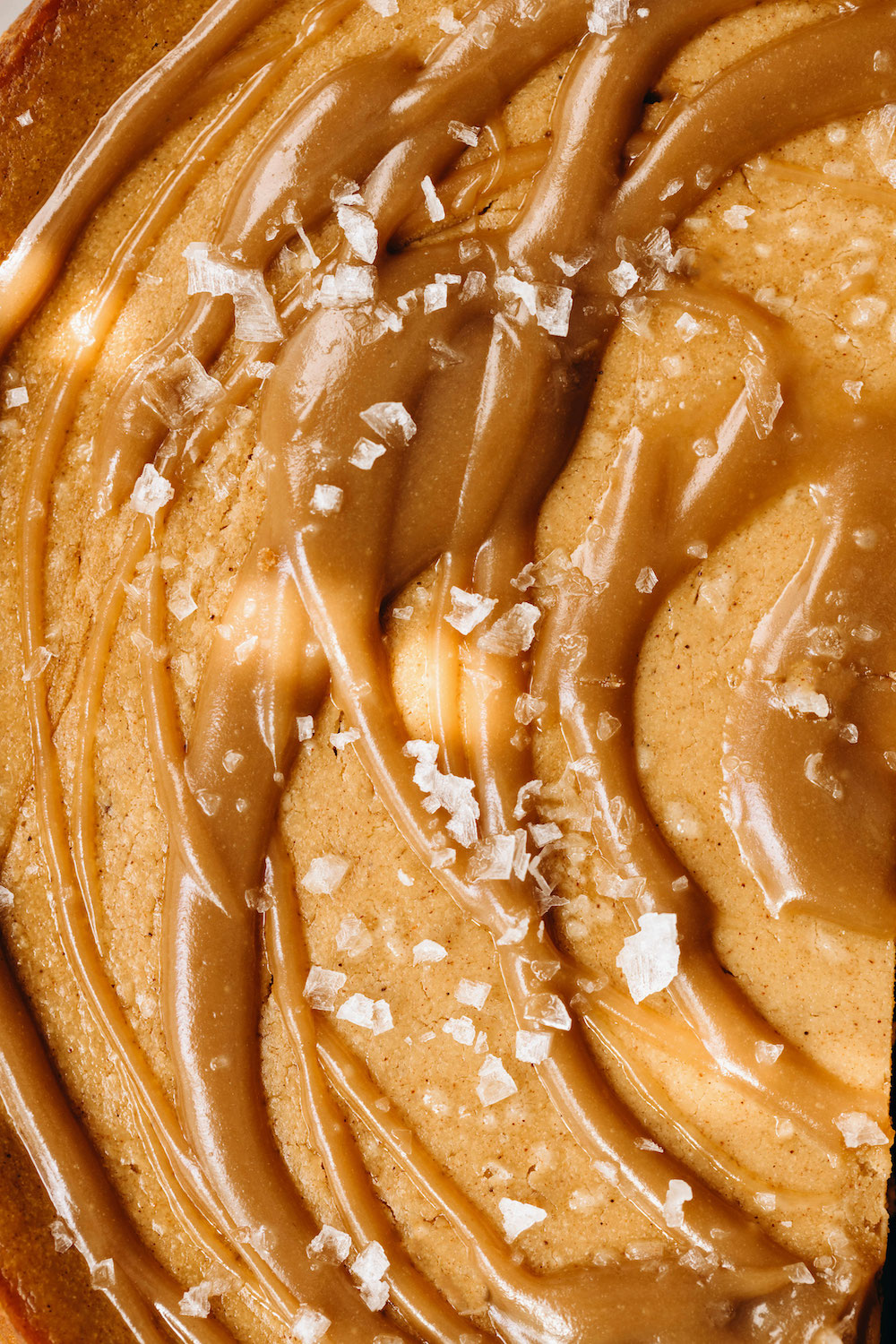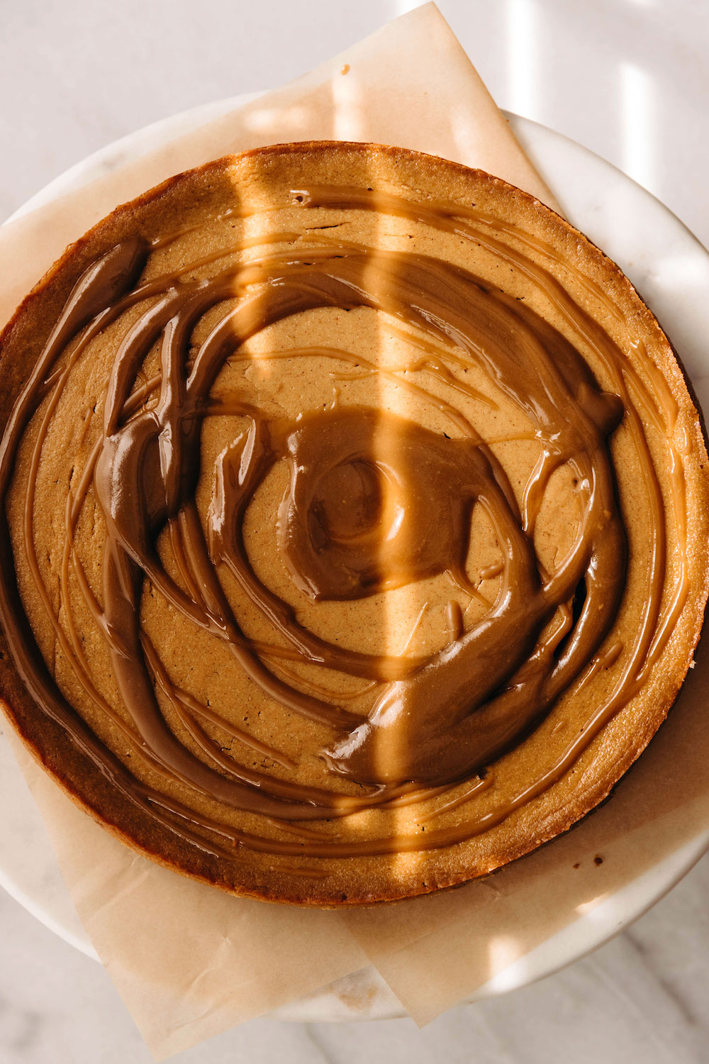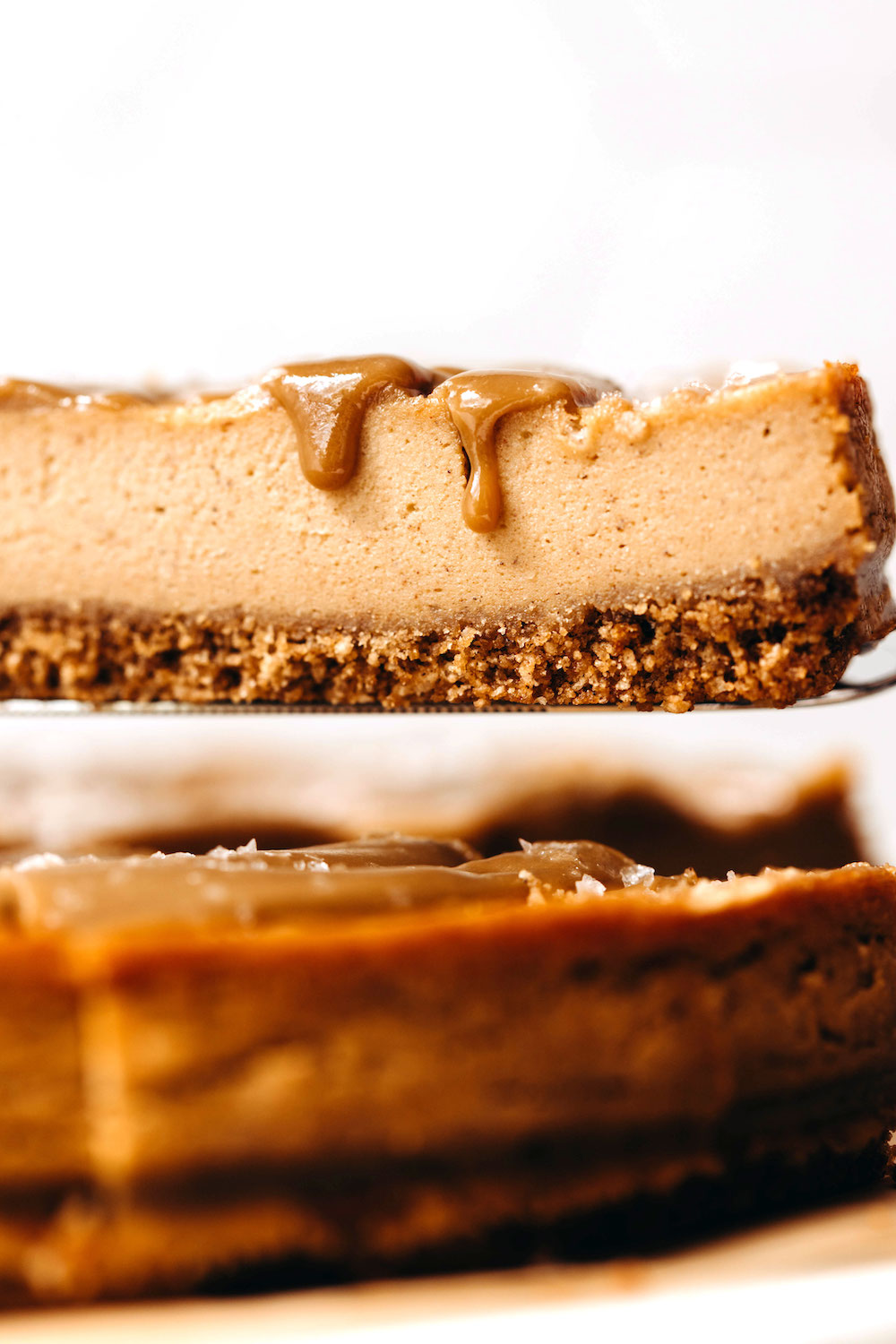 The delicious finishing swirl to our already decadent dessert: SunButter caramel sauce. And even better, this one requires no cooking at all just a simple whisk. Combine Creamy SunButter with equal parts liquid sweetener of choice (I used maple syrup, the flavor is so yummy with pumpkin spice!), a couple tablespoons of coconut oil, vanilla, and salt. Whisk until silky and drizzle-able, heating briefly if it’s too thick or chilling briefly if it’s too thin. You can use this sauce for so many things, but swirling on top of your cooled and ready-to-be-cut pumpkin cheesecake should definitely be one of them.