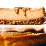 I typically share a new spin on pumpkin pie every November, but this year I thought I’d go pie adjacent and create the perfect pumpkin CHEESECAKE instead. And I’m not talking no-bake freezer cheesecake, I’ve done that before, and while it’s a creamy fall fave I wanted a cozy, golden-edged, real deal baked recipe this time. So I’ve blended and baked and taste tested, and I absolutely adore the results. And the salted SunButter caramel swirl on top is just the fancy-ish finishing touch this cheesecake doesn’t need but definitely deserves.