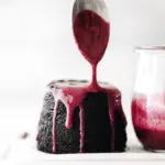 Easy berry brownie for one! Made with good stuff like oat flour, SunButter, chocolate chips, and topped with a dreamy berry glaze. Vegan and gluten-free!