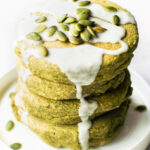 I tested an oat flour version and an almond flour + tapioca starch version. (Hence the two sets of photos happening here.) The oat flour batch turned out fluffier and cooked more easily and evenly too. The almond + tapioca batch was a bit less fluffy and harder to flip, but tasted sweeter and richer. And almond flour definitely wins on prettiest shade of green, just an fyi for Instagram purposes. Because if you try them you must tag me so I can witness the green fluffiness and be inspired by your topping choices and get all jazz hands emoji excited with you. It’s gonna be great.