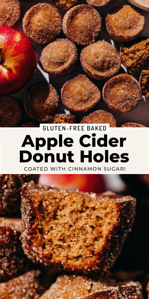 Summer is my favorite season for the weather, the vibes, the vacations, the ice cream. But I must admit, fall really does win when it comes to baking. Aside from everything pumpkin spice (which I do deeply love) we get flavors like apple, cinnamon, pecan, chai, and maple too, which are all so dreamy to bake with. So instead of opening up a can of pumpkin to kick off the fall baking season, I decided to open a bottle of apple cider and whip up some gluten-free apple cider donuts but in sweet, bite-sized, cinnamon-sugar-coated donut hole form.