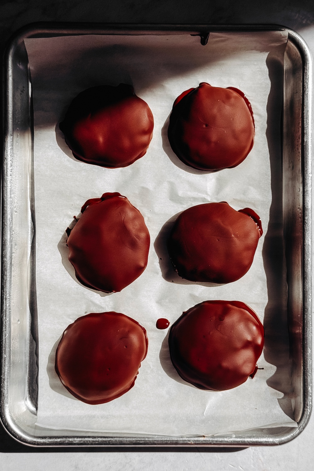 - Place back on the lined baking sheet, top with a sprinkle of flaky salt (optional), and freeze 10 minutes until the chocolate is set.