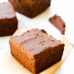 …it happens to be fat free, fruit-sweetened, raw, and ridiculously easy (3 ingredient easy!), but it doesn’t taste like any of those things. It tastes like thick chocolate heaven. It was so good I kept “taste testing” it from the blender, so there was only enough frosting left for half the brownies. Oh well.