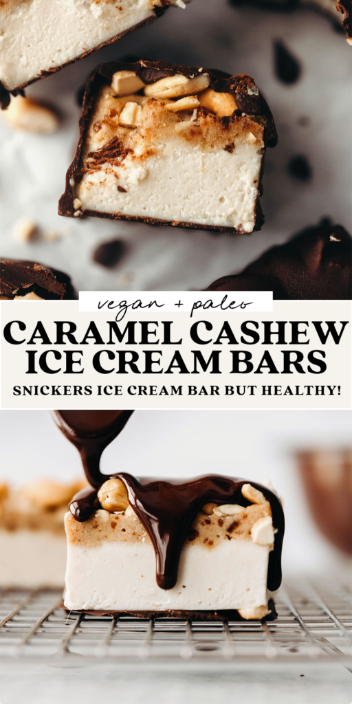 Dairy-free ice cream, gooey date caramel, toasted cashews, all bundled in dark chocolate. Think: snicker’s ice cream bar but vegan and paleo!