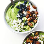 Super creamy Medjool Date Green Smoothie (or soft-serve style bowl) with good stuff like kale, spinach, yogurt, cashew butter, cinnamon, and ZERO bananas!
