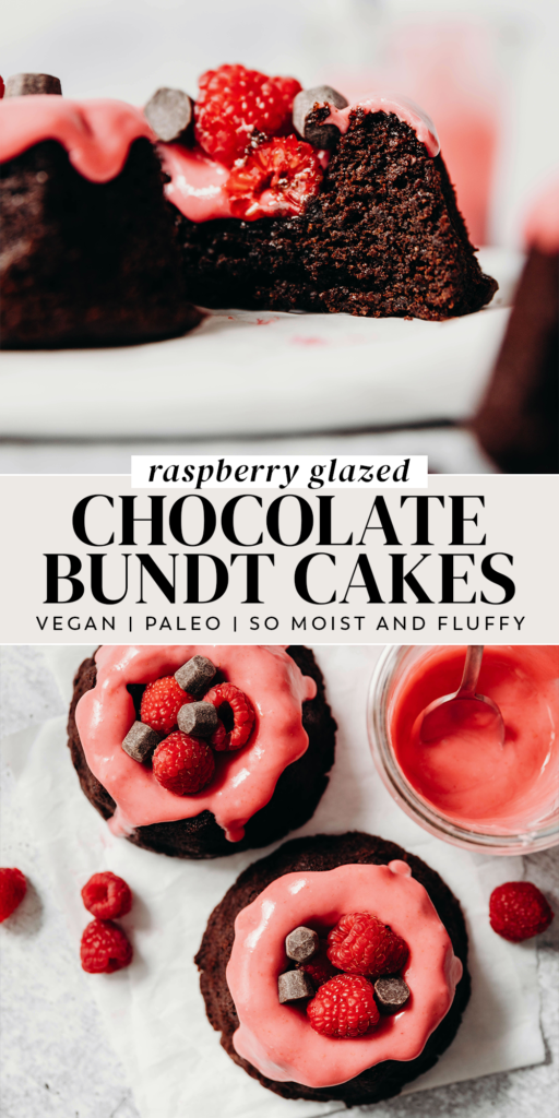 These decadent mini dark chocolate bundt cakes are vegan and paleo topped with a sweet berry glaze. Perfect mother’s day or spring treat!