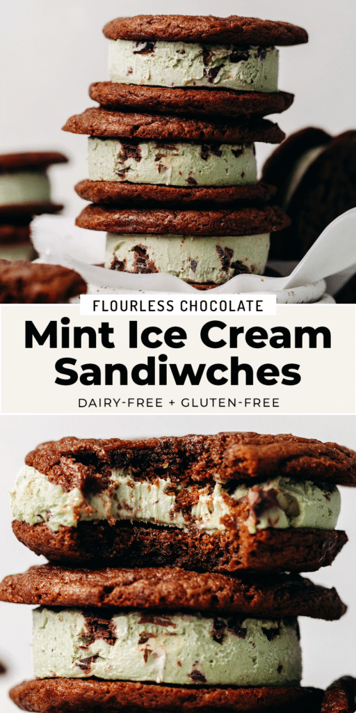 Homemade mint chocolate chip ice cream sandwiches with a chewy flourless chocolate cookie on the outside and creamy dairy-free mint chip ice cream on the inside. This easy gluten-free cookie sandwich recipe is sure to be a summer hit!