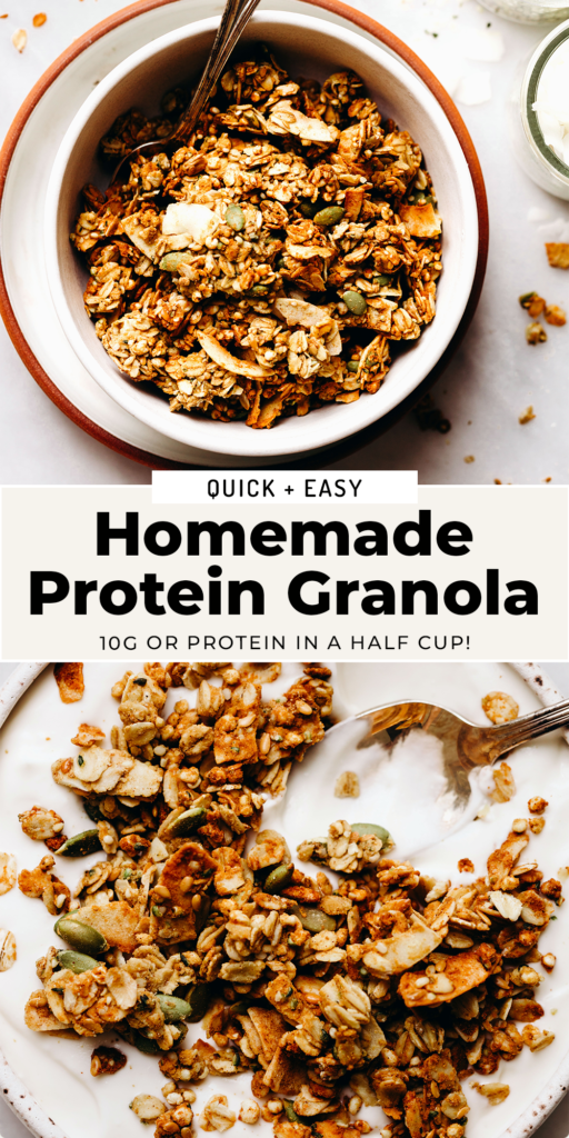 Quick and easy protein granola with 10g of protein per serving! Toasty clusters of oats, seeds, coconut, protein powder, and optional egg whites make this a delicious healthy snack perfect with milk, on top of yogurt, or by the handful!