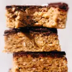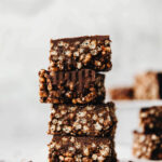 Your favorite crispy cereal treat, but with a plant-based protein boost and snappy salty dark chocolate topping! These protein rice crispy treats are nut free made with SunButter and marshmallow free with maple syrup to sweeten instead. A perfect easy healthy snack or no-bake dessert!