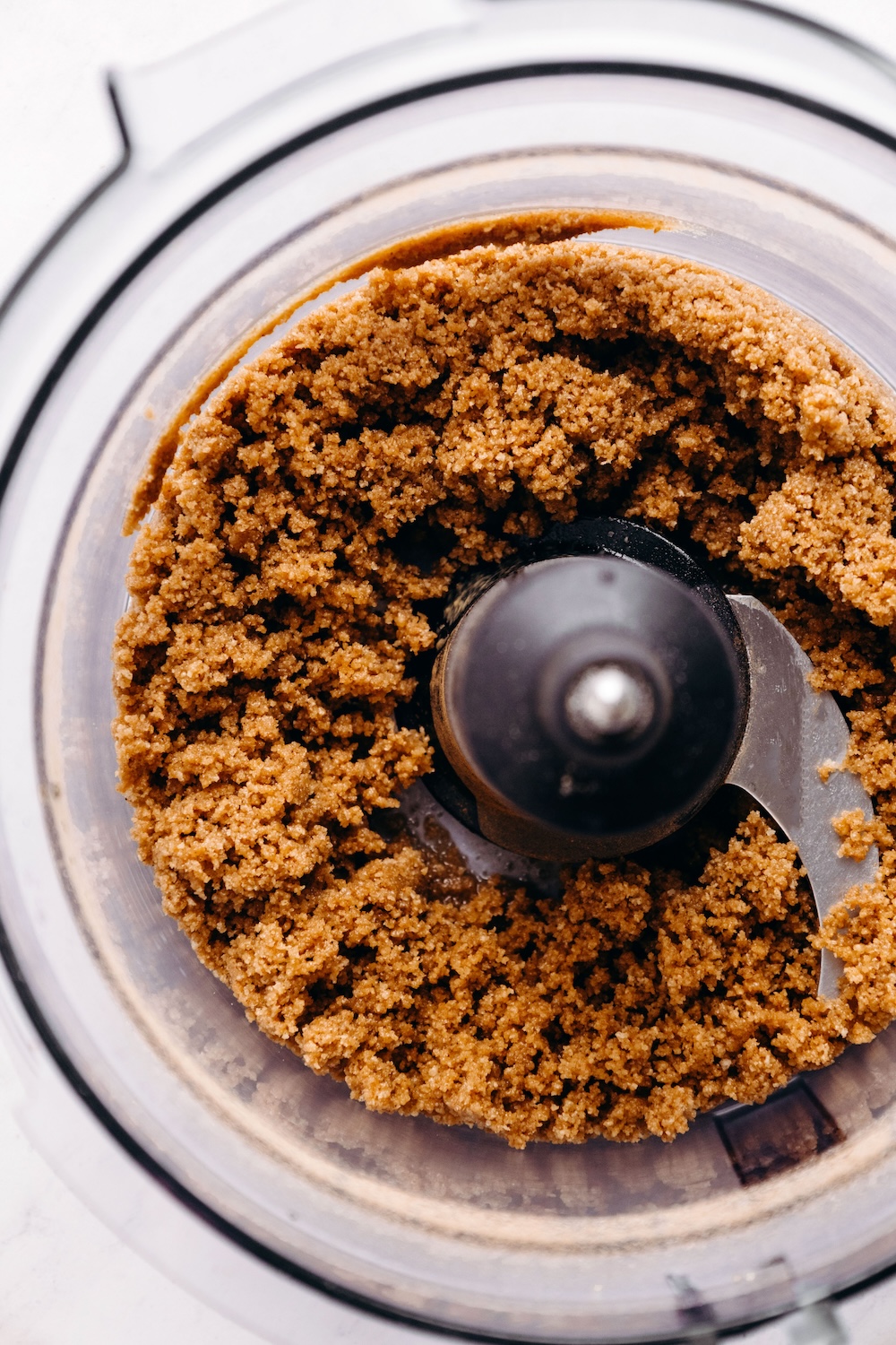 Anywhere a graham cracker crust is called for, this easy cereal swap can create a just as delicious crumb crust. I like to use toasted brown rice cereal (not puffed!), but honestly most crispy cereals or even crunchy oat-based granolas will work. Grind the cereal to a fine sandy crumb just like you would graham crackers, and then add in flavor and sweetness since plain rice cereal doesn’t have all the flavor graham crackers come with. I used maple syrup since it’s fall of course, pumpkin pie spice, and a pinch of salt. Then instead of melted butter like you’d typically use in a graham cracker crust, I used No Sugar Added SunButter to bind it altogether and make it deliciously buttery and tender. Any creamy variety of SunButter will work perfectly here.