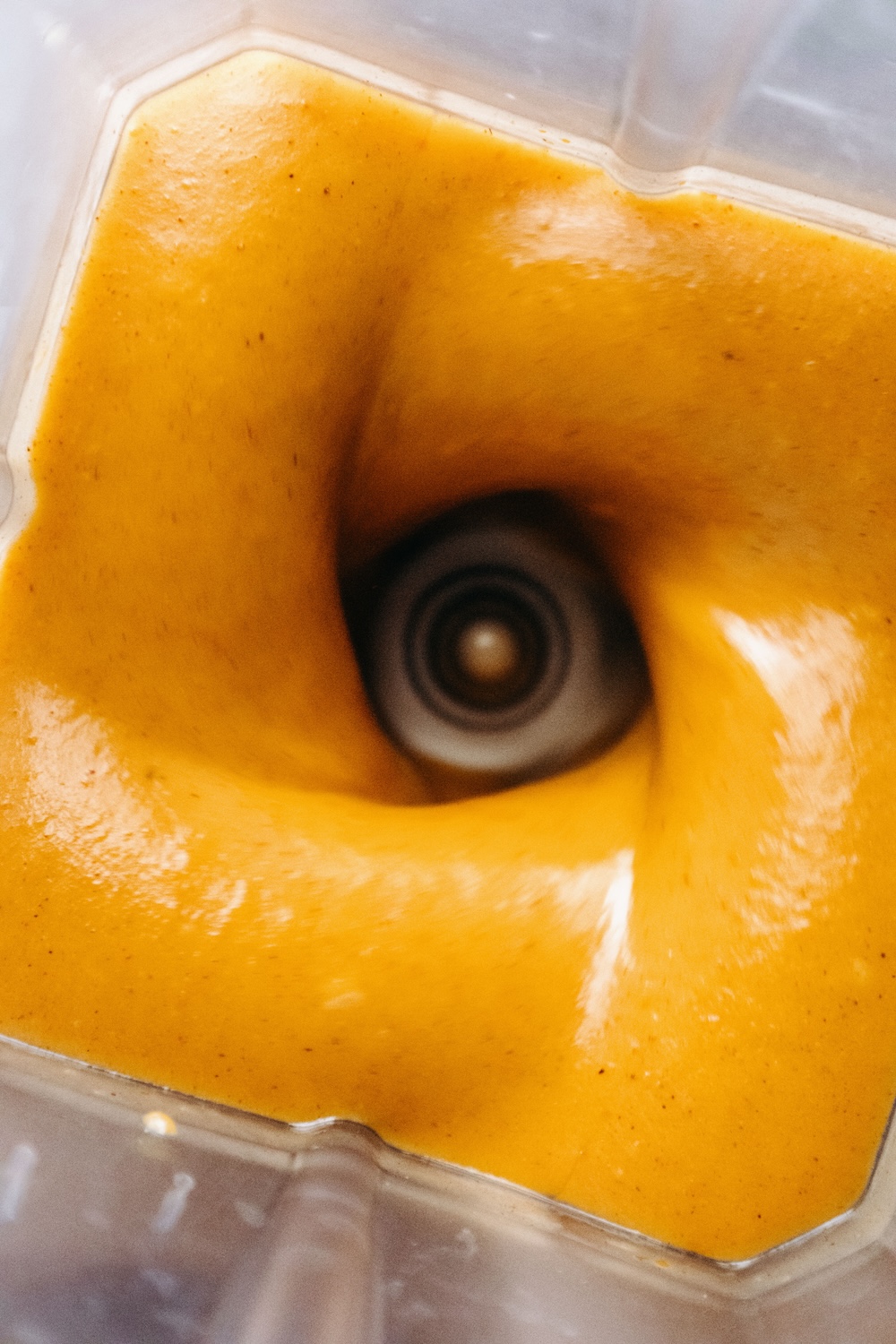 - Blend the pumpkin puree, sweetened condensed coconut milk, and pumpkin pie spice for the topping.