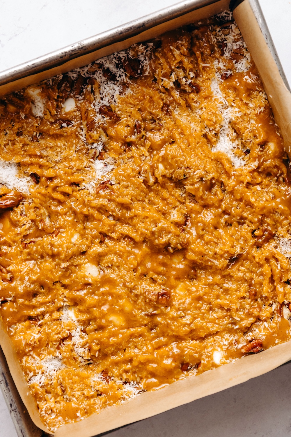- Evenly distribute the white chocolate chips, pecans, and coconut on top of the pumpkin layer.