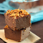 Silky decadent 2-ingredient fudge layered on top of buttery shortbread and topped with sweet-tart raspberries. Vegan, paleo, SO EASY!
