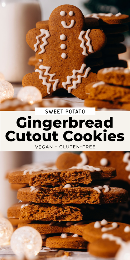 A unique twist on gingerbread cookies with sweet potato snuck into the batter for a healthier, tender, moist, chewy cookie. These gluten-free cutout cookies are still full of molasses and all the classic gingerbread baking spices, plus holiday decorated with an easy vegan “royal icing” recipe!