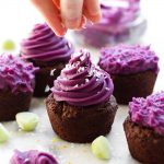 These Vegan Halloween Cupcake Monsters are more sweet than spooky with a dark chocolate cupcake, naturally purple frosting fur, and big green grape eyes! Vegan, gluten-free, naturally colored.